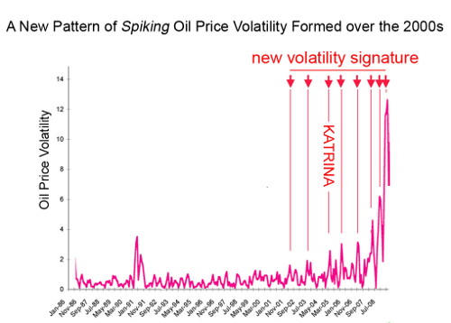 The crux of the essay is a chart (see below) showing that during the 2000s oil price volatility rose and fell over time in a distinct series of spikes.